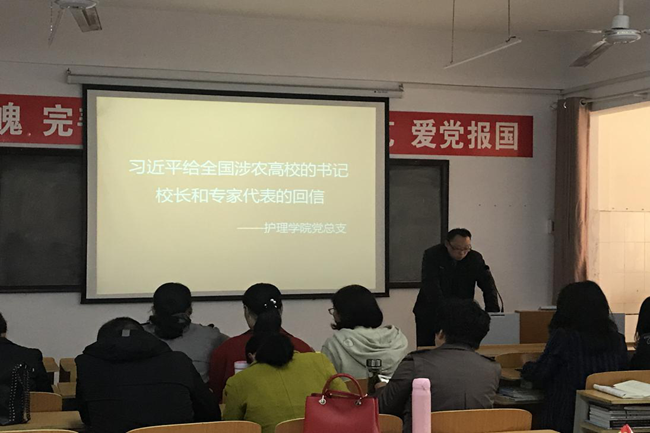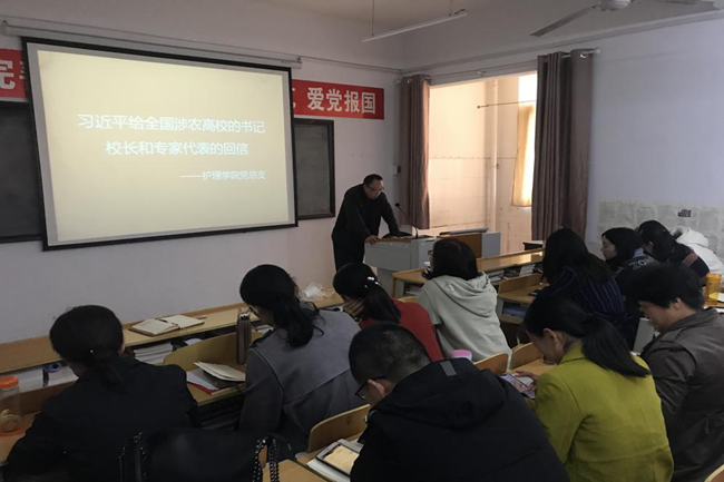 护理学院在2019年10月17日,组织全体教师在红山校区护理实训楼第四多媒体教室深入学习“2019年9月5日习近平总书记给全国涉农高校书记校长和专家代表重要回信”的精神。回信中对涉农高校加强人才培养与科技创新、服务“三农”事业发展予以充分肯定,对新时代高等农林教育发展提出了殷切期望。护理学院全体教师均倍感亲切,又深感到责任重大。作为一名高职高专的教师,就是要服务于国家,为中国的大发展,为洛阳的大发展,为洛阳职业技术学院的美好明天做出自己的贡献。
