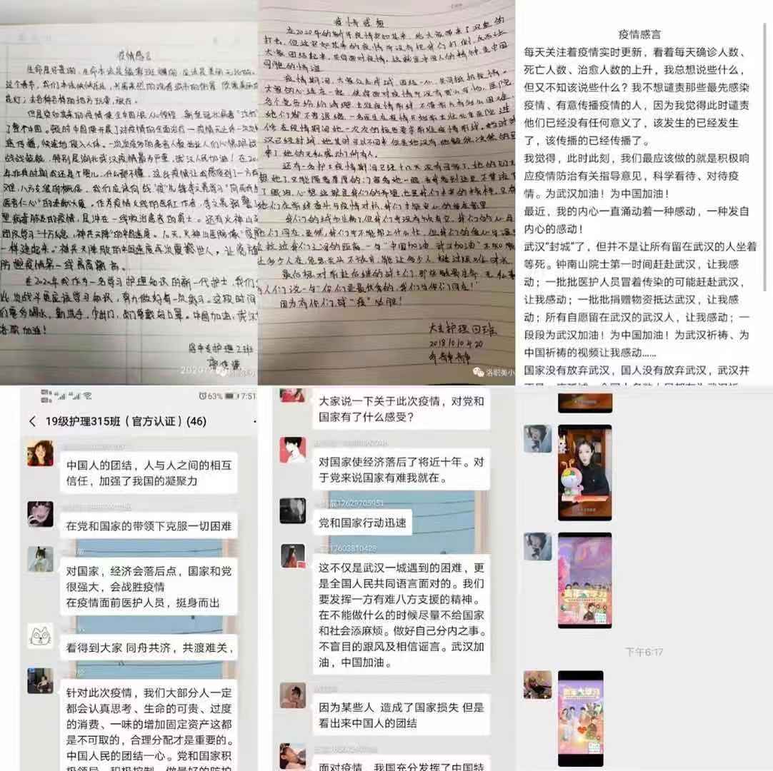 疫情面前,护理学院辅导员进一步的提高自己政治站位,把疫情防控工作作为当前最紧要的政治任务,认真贯彻落实习近平总书记关于疫情防控重要指示精神,坚定不移把党中央、国务院的决策部署和上级部门的任务要求落到实处,坚持用“四个意识”导航,用“四个自信”强基,用“两个维护”铸魂,坚守初心,勇担使命,切实做到守土有责、守土担责、守土尽责及时发出声音,做好学生的思想引导员。这段时间,护理学院团总支通过开展青年大学习、网上团课等形式,辅导员队伍通过微信、QQ、网站等形式,及时将习近平总书记关于疫情防控的重要指示精神,以及中央、省市和学校各项防控举措传达到学生心里,筑牢抗击疫情的思想防线。