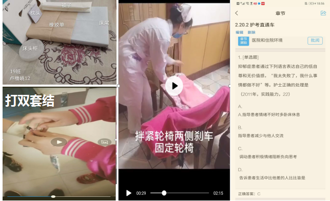 《基础护理学》课程组应用“超星学习通”进行线上授课,精心设计课前、课中、课后的教学安排。课前上传教学资源(校级精品课、大学慕课、护考直通车等),督促学生预习、做笔记;课上充分利用“学习通”进行在线直播授课或结合其他直播软件(QQ、雨课堂、钉钉等),通过发起“选人”、“抢答”、“测验”、“投票”、“问卷”、“讨论”等多种课堂活动,与学生进行互动答疑,充分调动学生的积极性;课后布置作业(录制操作视频、护考直通车、拍照片),或发放调查问卷,检测教学效果。