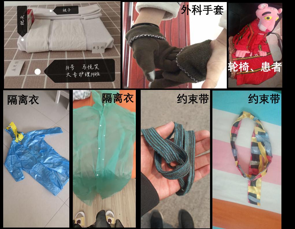 为最大程度的模拟线下实训教学,满足学生对护理操作流程的训练需求,保证教学质量,学生们深受老师启发,积极踊跃寻找与实训课相关的道具。比如:用课本模拟床单位,用盒子模拟枕头,用卫生纸模拟橡胶单,用棉手套模拟一次性外科手套,用靠背椅模拟轮椅,用磨绒玩具模拟患者,用雨衣或防晒衣模拟隔离衣,用丝巾或绳子模拟约束带等等,可谓琳琅满目。