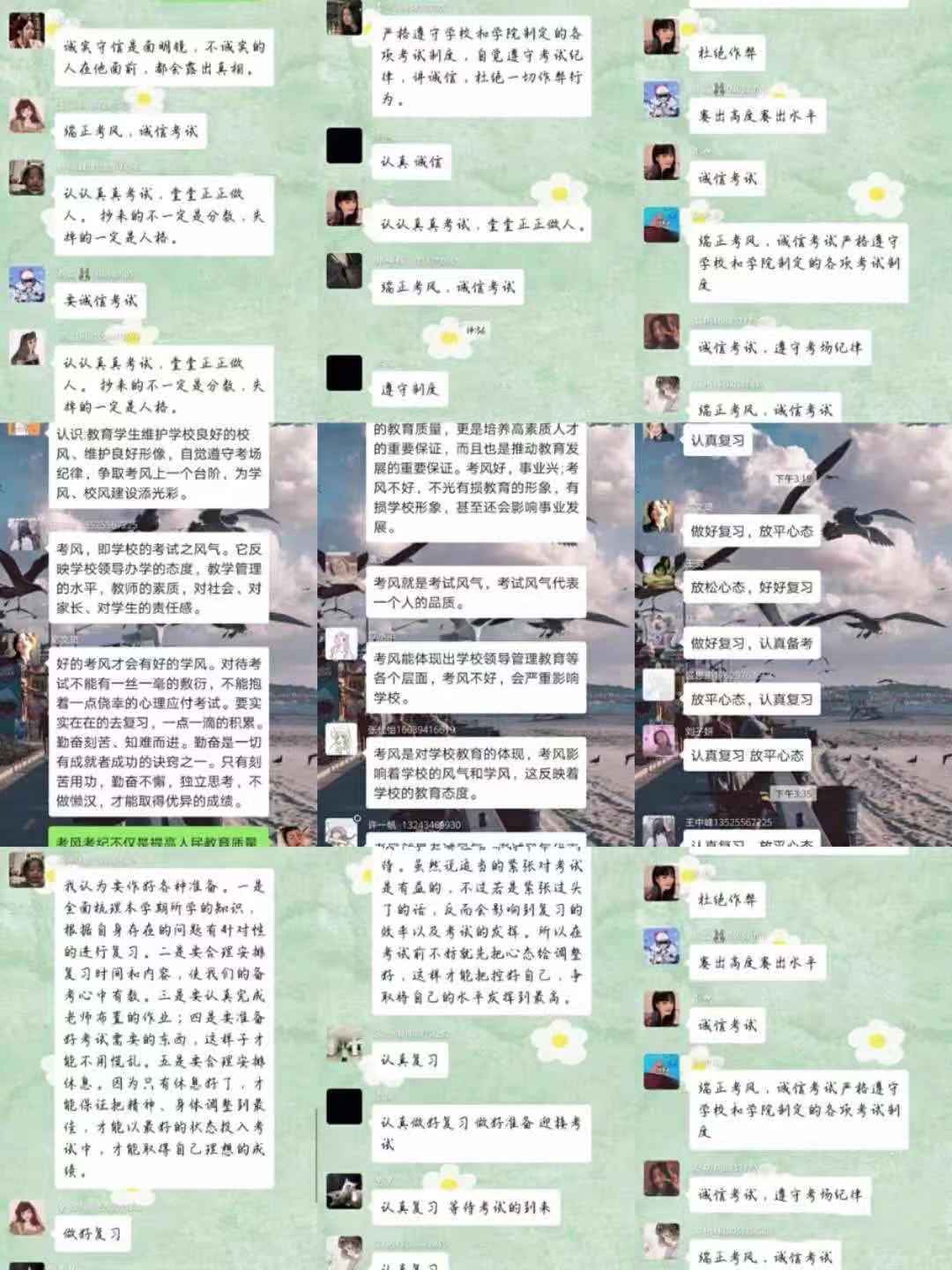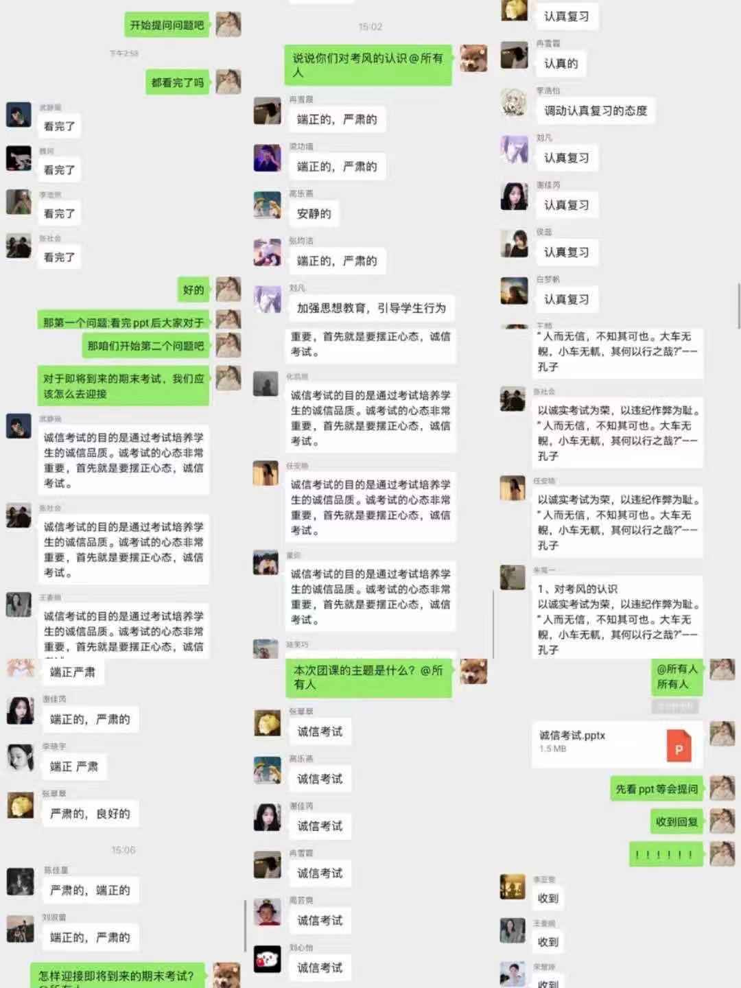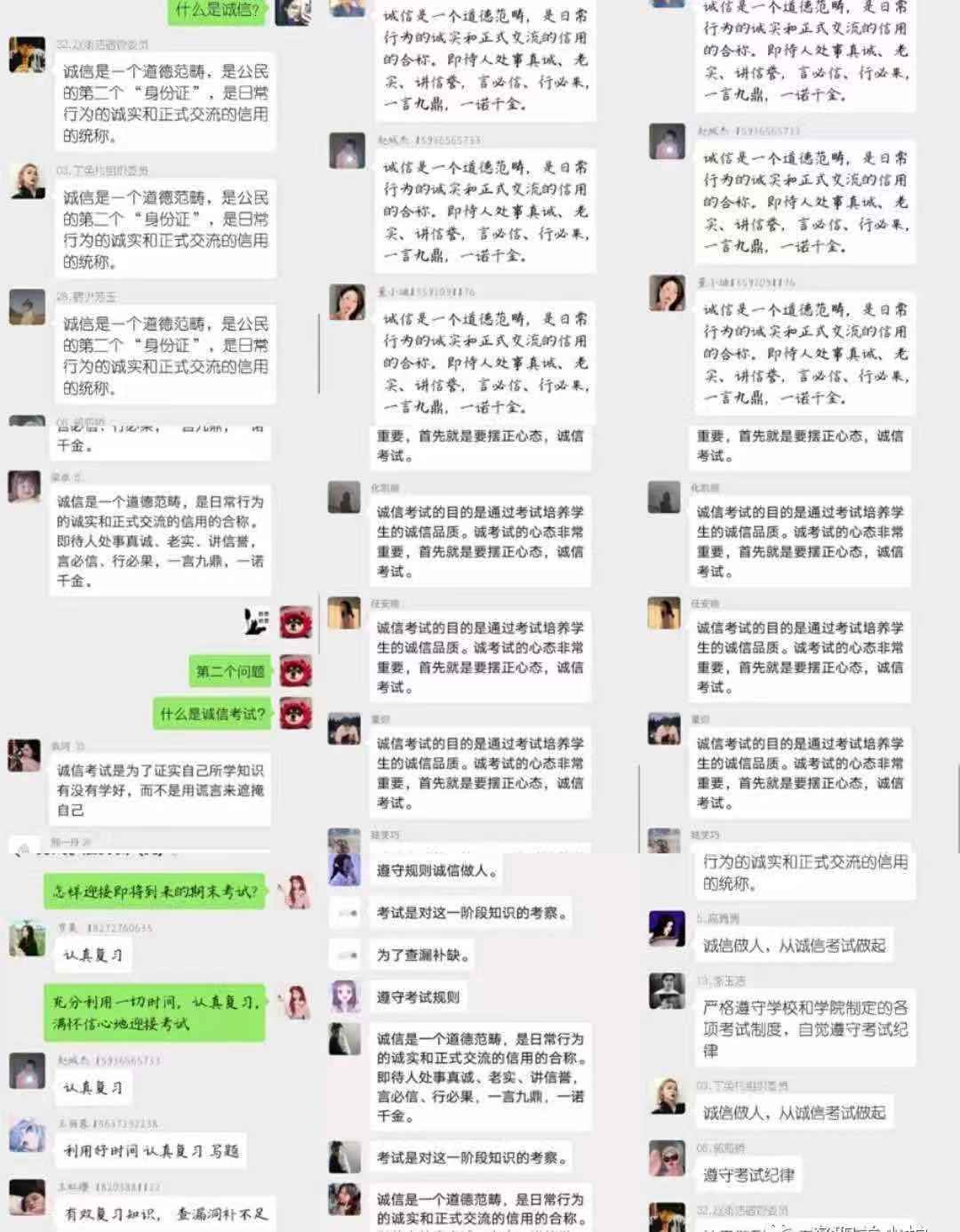 在6月11日下午护理学院开展了以“诚信教育”为主题的线上团课。由团支书组织开展,各班同学参与。本次团课主要内容为“诚信是什么”,同学就此展开讨论。