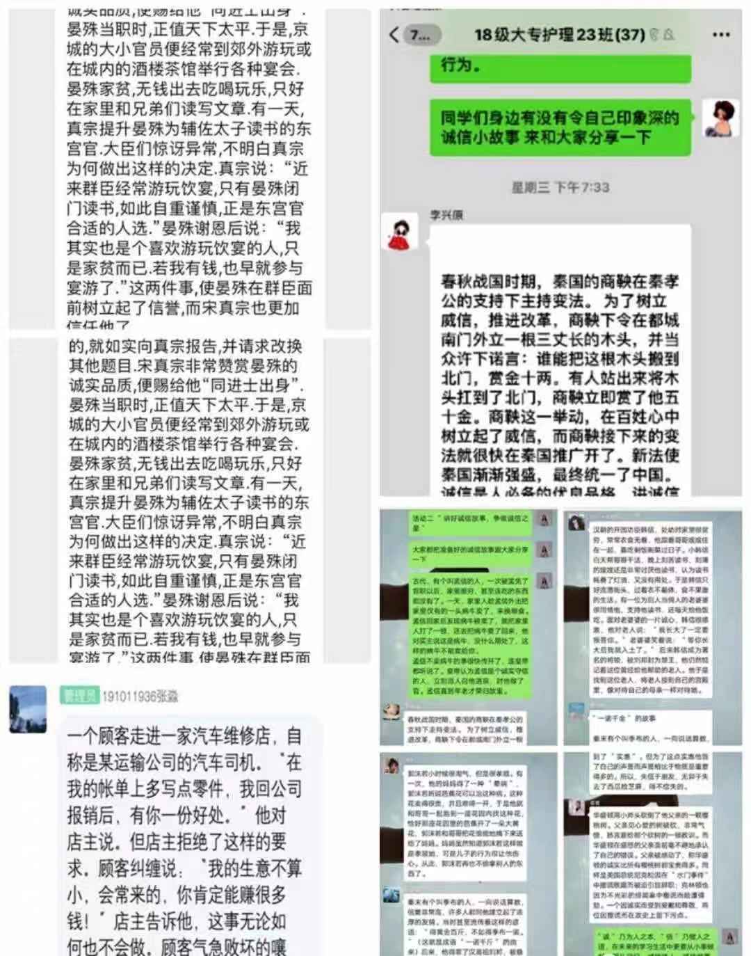 为切实增强学生的诚信意识,培养学生诚信品质,达到文化育人的目的,护理学院组织开展了“讲好诚信故事,争当诚信之星”主题教育活动。各班同学积极收集古今中外各种深刻而有意义的诚信故事,在班级群中通过文字和图片的形式分享给全班同学。通过讲故事的方式,让学生关注诚信,在讲述的过程中弘扬真善美,汲取正能量。同时,同学们还分享了发生在自己身上和身边的诚信小事,将诚信品质切实转化为行动,言行一致,表里如一。