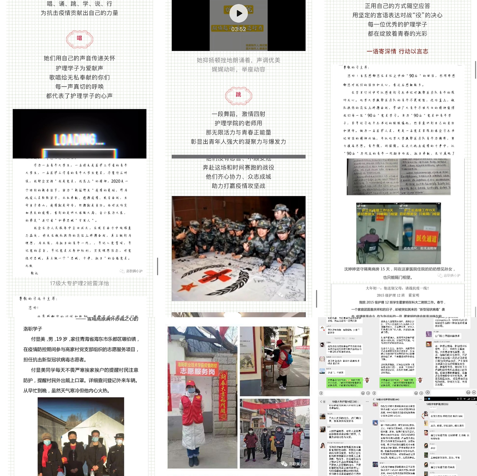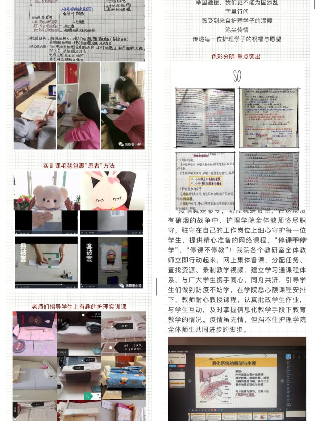 二、第一课堂和第二课堂相结合原则。要充分发挥课堂教学主渠道作用,同时积极拓展活动载体,在疫情期间停课不停学,开展线上教学,在线上教学中使用各种形式穿插疫情知识及医护工作者的典型事例,微课视频、动画短片、实践操作等方式将疫情与理论学习相结合。同时开展线上团日活动,例如护理学院师生在学习习近平总书记给援鄂医疗队回信后,通过唱、诵、跳、学、说、行的方式用声音传递关怀为爱献声、用笔尖传情传递学子的祝福;结合疫情,护理学院开展线上“5.12”国际护士节系列活动,其中手抄报比赛学生们纷纷拿起笔,以“抗 击疫情,众志成城”为主题创作出一幅幅美术作品,微视频比赛学生们创作歌曲《战胜一切》,向奋战在一线的各行各业“逆行者”致敬。