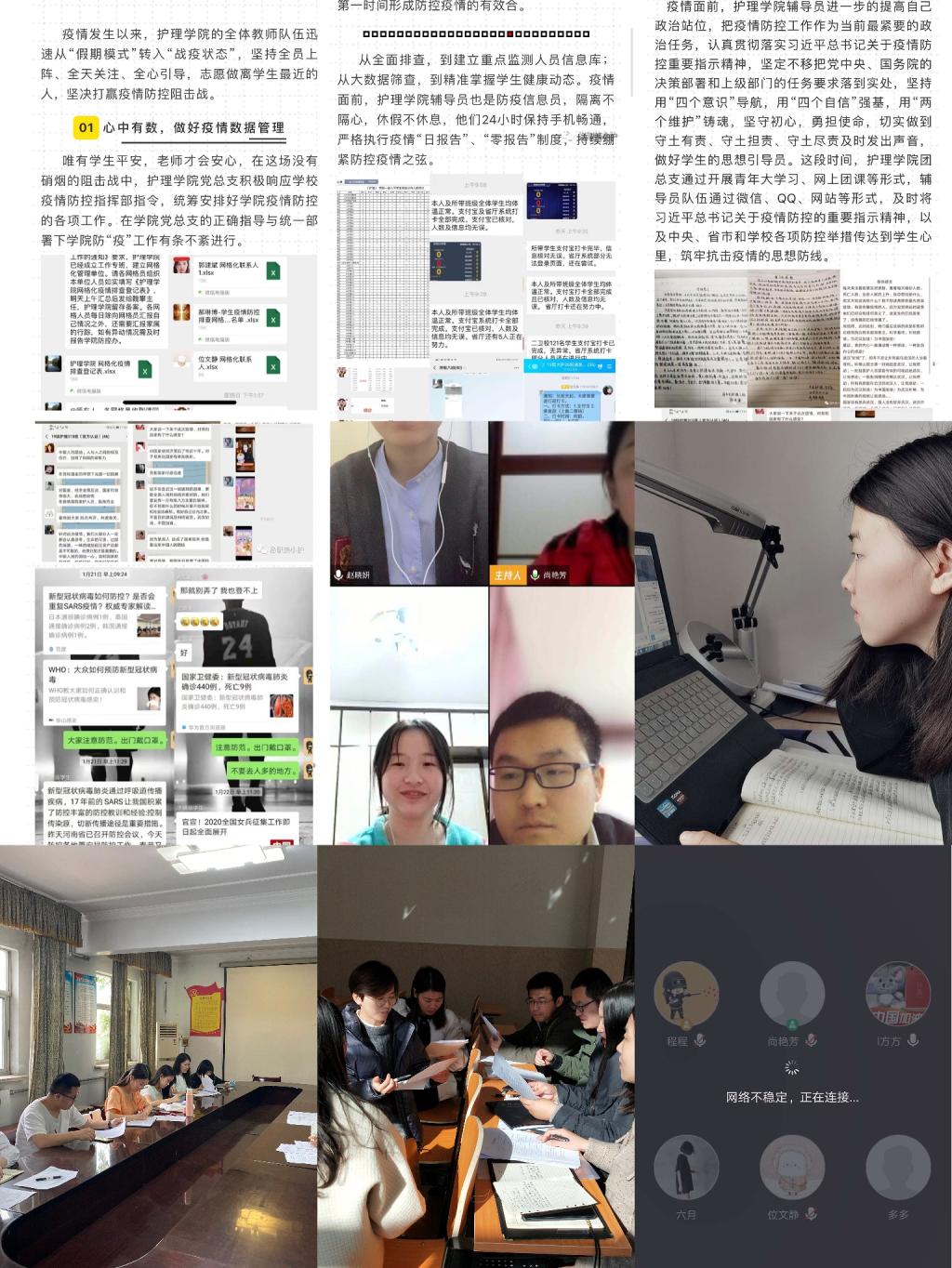 三、线上与线下相结合原则。护理学院教师在疫情面前全面推进网络文化建设与管理,积极开展网络主题教育活动及网络化管理,不仅要“面对面”,同时做到“键对键”,善于运用网言网语做好教育引领工作,辅导员通过班级群、网格长等建立四级疫情防控网络,将学院3000余名学生动态一一掌握、严格把关做到不给国家、社会、学校增添负担,众志成城,共同抗疫;2020年5月护理学院迎来首批“返校复学”学生,院领导高度重视护理学院认真落实,在开学第一课中将疫情背景和爱国主义情感教育相结合。