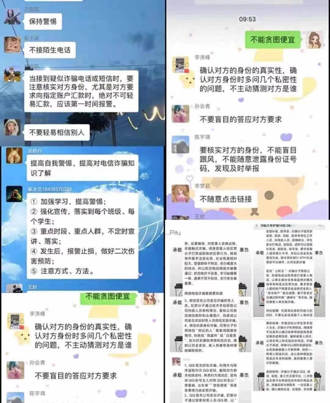 主题三:防范网络诈骗,警惕不良贷款教育。利用班会、微信、QQ等线上平台,教育学生如何防范电信诈骗、远离不良网贷。在班会中帮助学生分析梳理了电信诈骗以及网贷的特点及常用手段,如何识别电信诈骗,并对如何防范电信诈骗以及不幸遭遇了电信诈骗时的紧急补救操作流程进行了具体解说。
