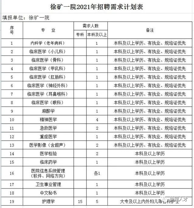 徐矿一院2021年招聘需求计划表