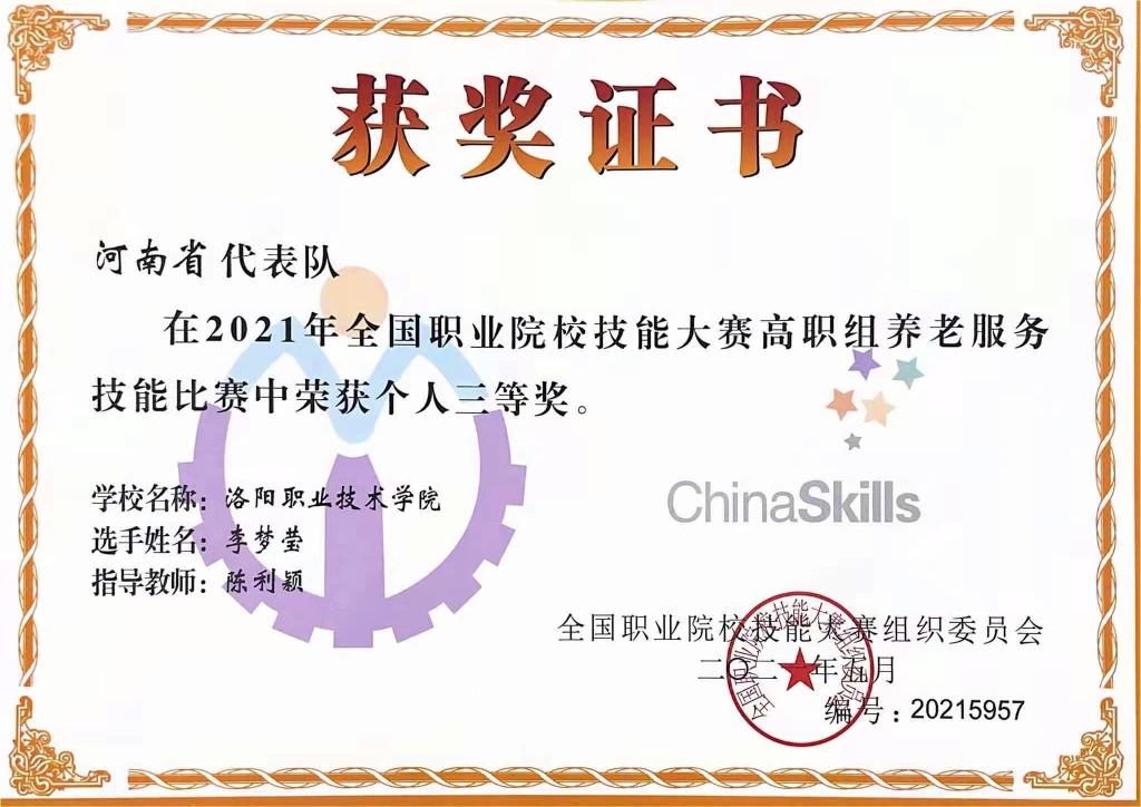 6月20日,2021年全国职业院校技能大赛高职组养老服务技能竞赛在山东潍坊护理职业技术学院顺利闭幕,护理学院老年服务与管理专业301班学生李梦莹荣获三等奖,这是我校老年服务与管理高水平专业群学生首次参加国家级赛事并获得奖项。