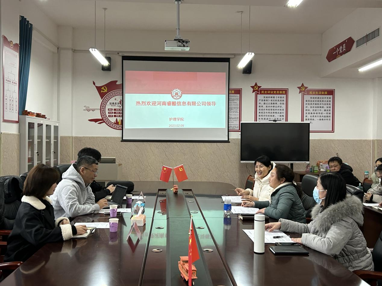 2月9日下午,护理与抗康养学院和河南睿酷信息有限公司校企合作洽谈会议在临床技能实训楼3楼会议室举行。河南睿酷信息有限公司CEO秦春晖、项目开发经理邢嘉辉、高级专员吴娟以及院长张彦芳、副院长刘书莲、王芳出席会议。