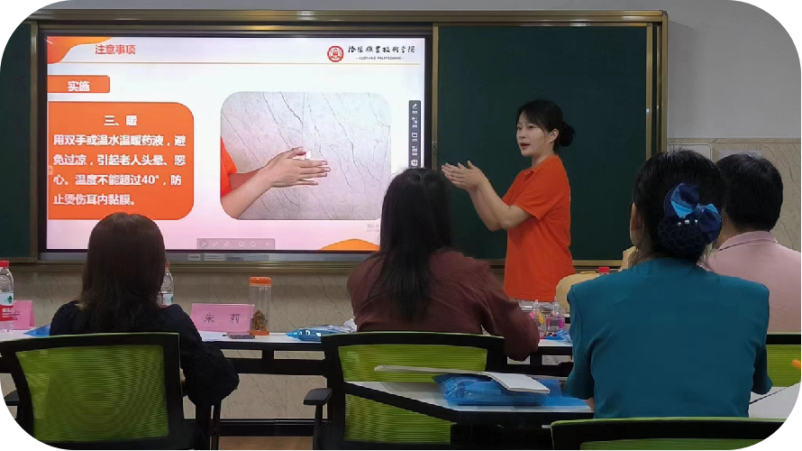 大赛邀请护理与康养学院教学督导组组长朱莉、基础医学院党总支书记崔颜宏、马克思主义学院副院长孙小利、医学技术学院副教授杨全中和戏曲艺术学院教科办主任王菲担任评委,护理与康养学院党总支书记楚继伟、副书记刘亚洲、副院长刘书莲及全体教职工观摩比赛。