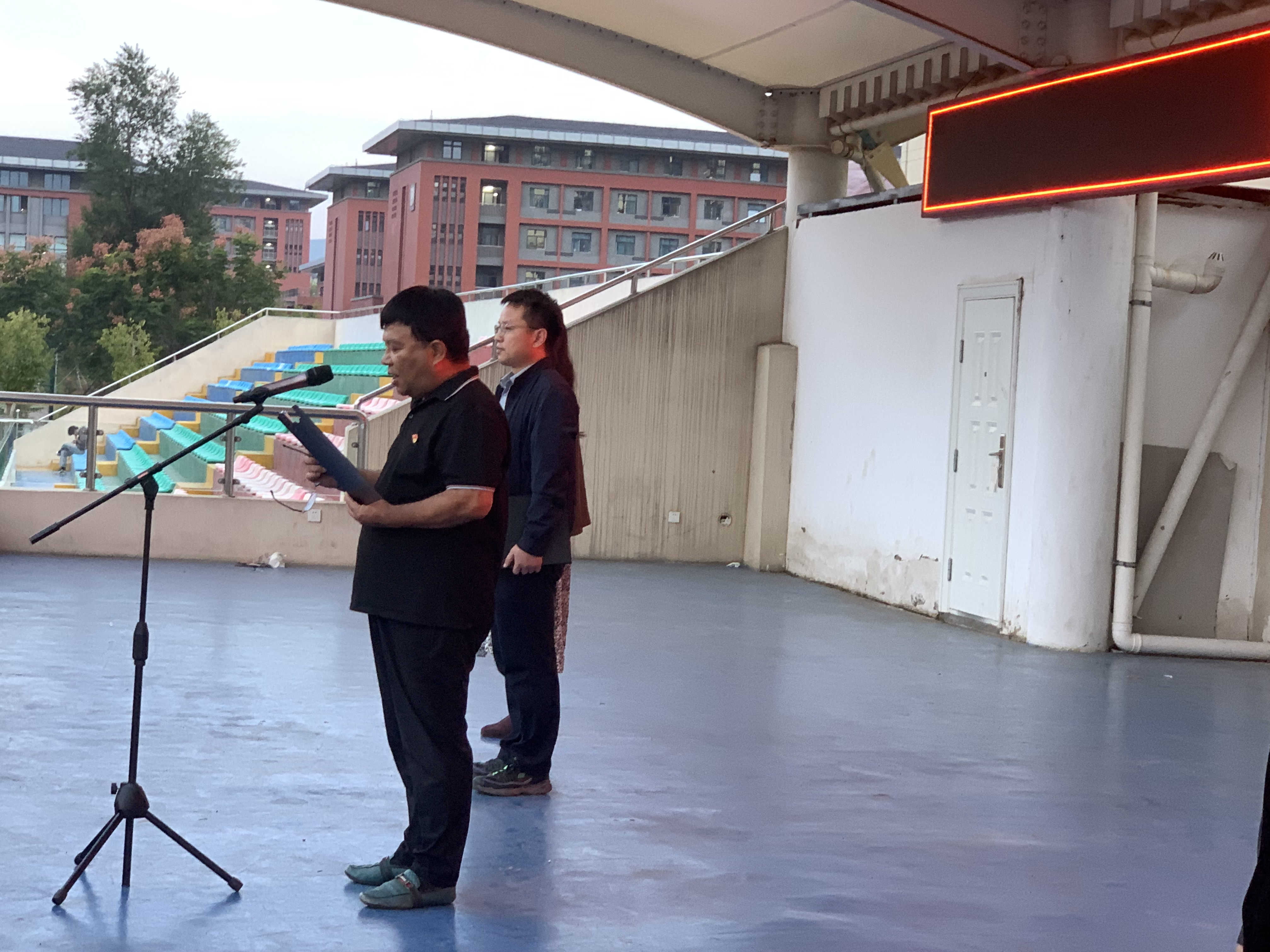 大会分为两项。第一项:奏唱国歌。在刘亚洲的“奏唱国歌”的一声令下后,全体师生行注目礼唱国歌。