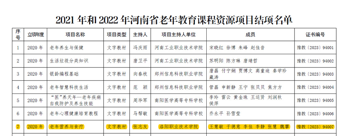 12月21日,根据《河南省教育厅办公室关于申报河南省老年教育课程资源项目的通知》(教职成函〔2020〕314号)和《河南省教育厅办公室关于申报2021年度河南省老年教育课程资源项目的通知》(教职成函〔2021〕470号)的要求,经资料查验、专家评审、网上公示等环节,护理与康养学院1门文字资源《老年营养与食疗》和2门课程资源《老年人日常健康照护技术》、《脑卒中的预防与照护》顺利结项。