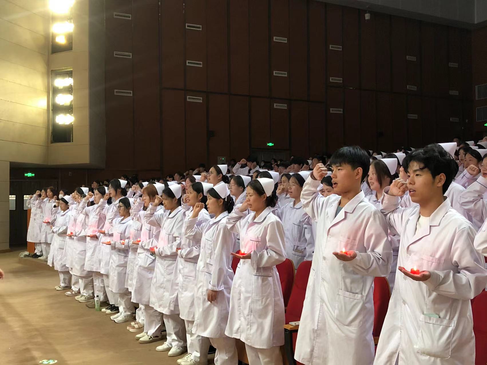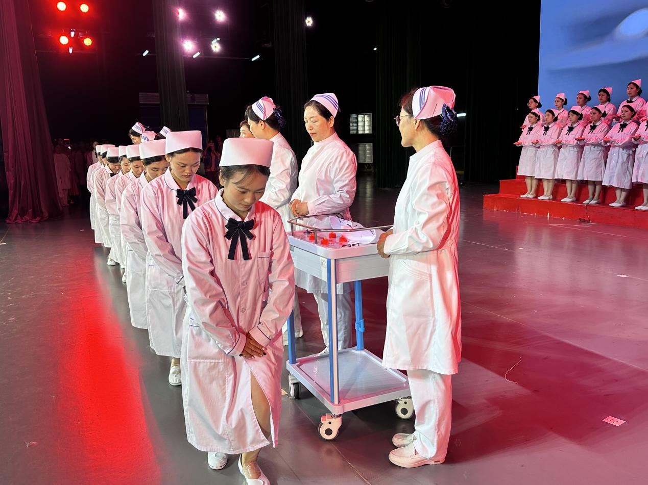 传光授帽宣誓仪式上,临床一线护理人员和洛阳职业技术学院护理与康养学院教师上台为护生代表戴上圣洁的燕尾帽,并带领全体护生庄严宣誓。