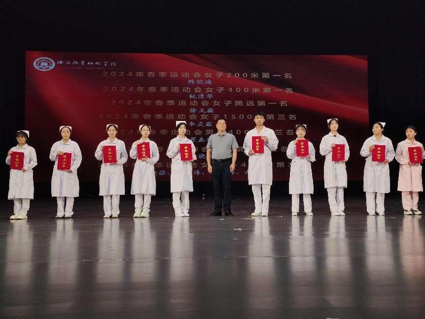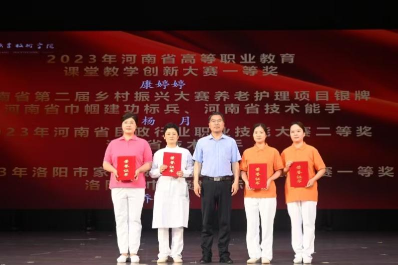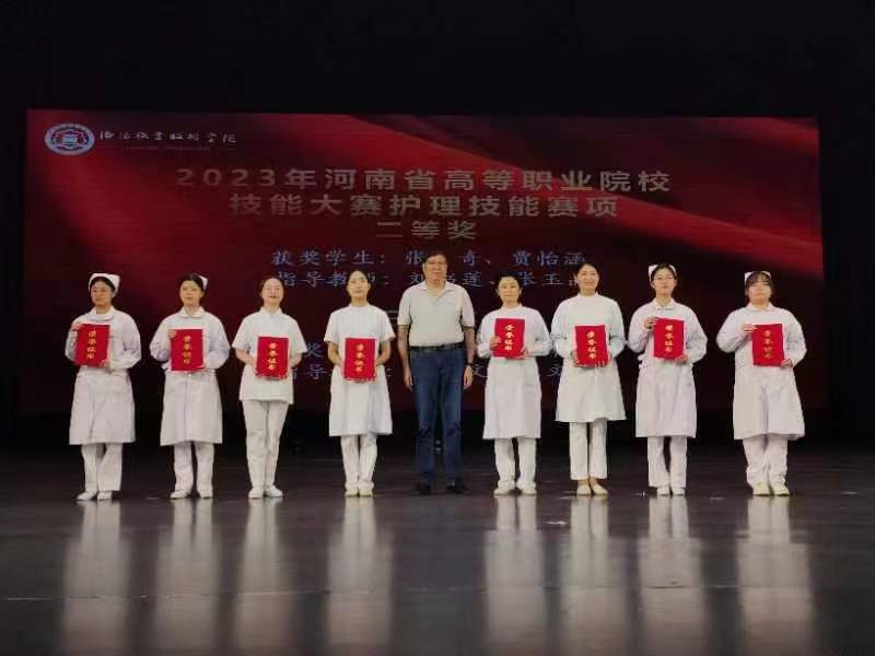 典礼现场,校领导为“2023年河南省高等职业教育技能大赛健康养老照护赛项一等奖”“2023年河南省高等职业院校技能大赛护理技能赛项二等奖、三等奖”“第十六届河南省“挑战杯”大学生课外学术科技作品竞赛二等奖、三等奖”“学校春季运动会获奖学生”“优秀学生干部”“优秀共青团干部”等获奖学生颁奖。