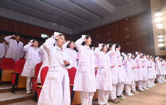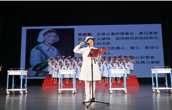 洛阳职业技术学院附属医院外科系护士长茹利敏带领全体新护生庄严宣誓:志愿从事护理事业,奉行革命的人道主义精神,坚持救死扶伤的信念,履行护士的天职……整齐响亮的宣誓声,是全场每一位护生的声声誓言,是护理人甘于奉献、积极进取的坚定信念,护理精神就在这一声声宣誓中代代相传。