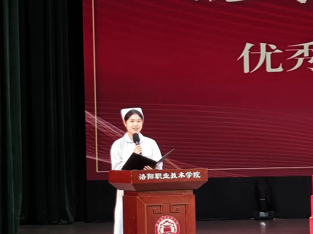 22护理312班王佳宝作为学生代表发言,她说从踏入洛阳职业技术学院的那天开始,便知道自己将成为一位白衣战士。护士的战场虽然没有硝烟战火,却同样有着流血和死亡。护士的使命是挽救生命,促进健康。每一项操作都关系着病人的利益和安危。大二学生马上就要走向实习岗位,要努力做到悟初心、守初心、践初心,在青春的赛道上争取跑出自己的最好成绩。