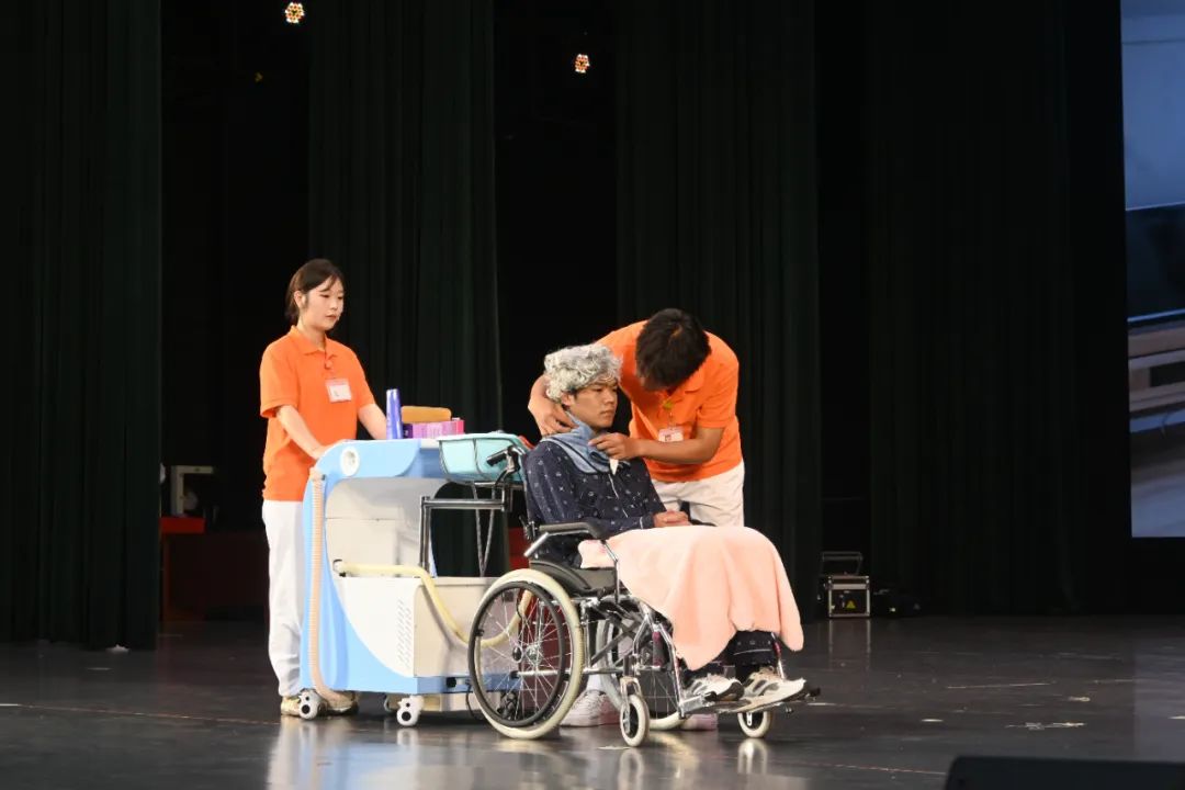 现场带来河南省护理技能竞赛项目--成人心肺复苏电除颤技术和河南省养老服务技能竞赛项目--为老人洗头等技能操作展示。