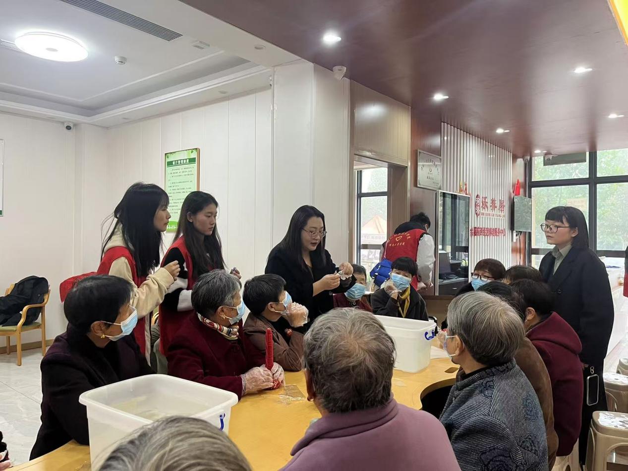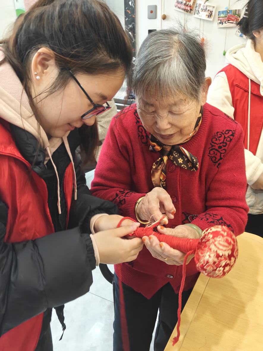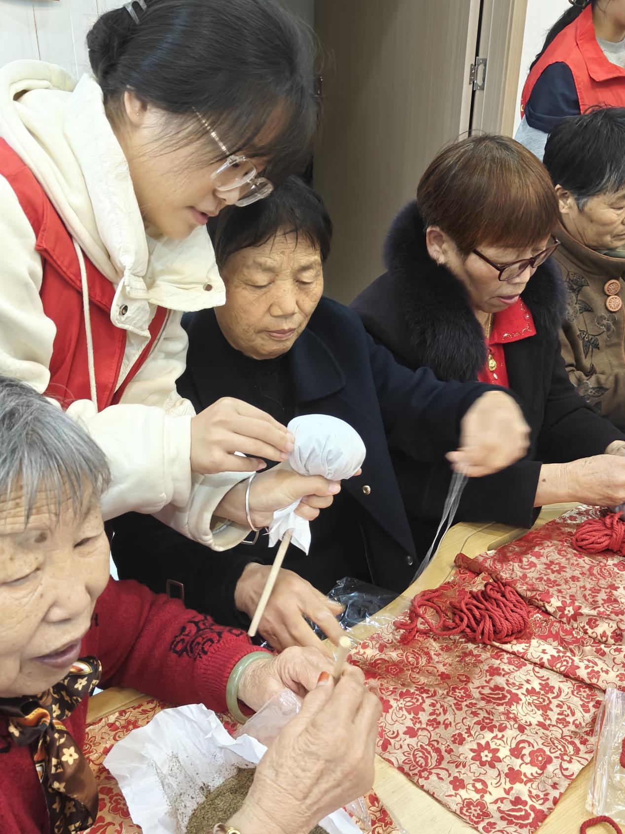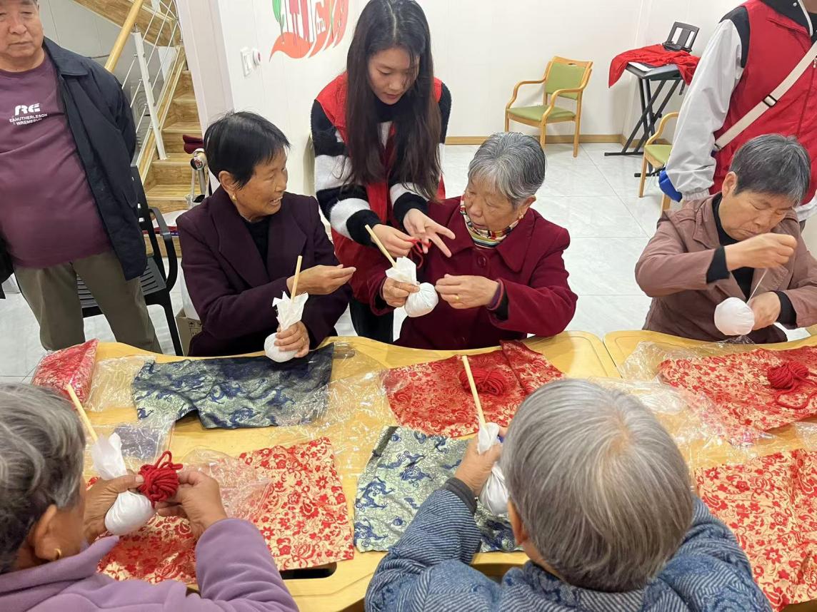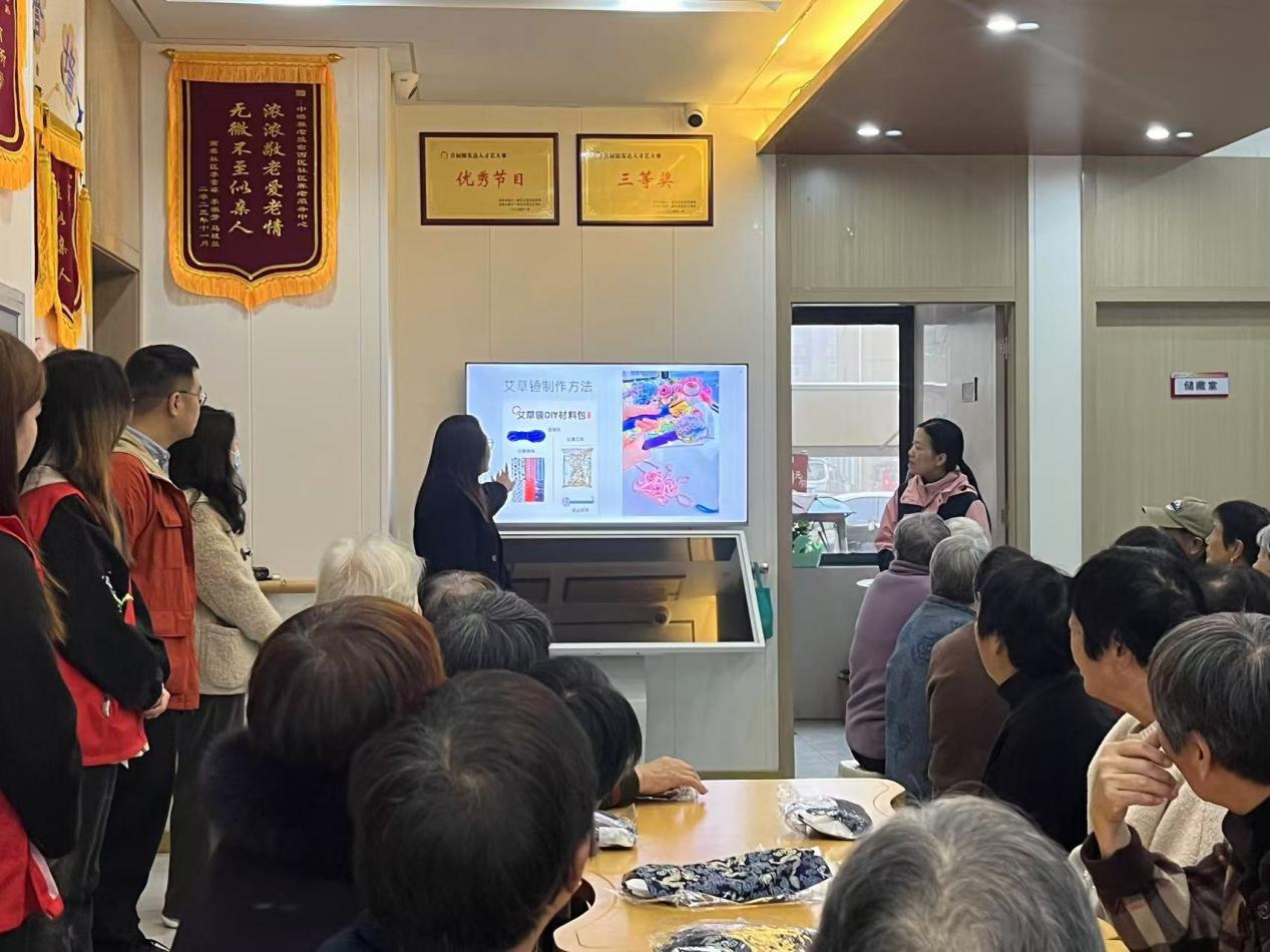 活动期间,杨佳怡老师向老人介绍艾草锤的功效及制作方法,和受助学生带领老人进行艾草养生锤的制作。