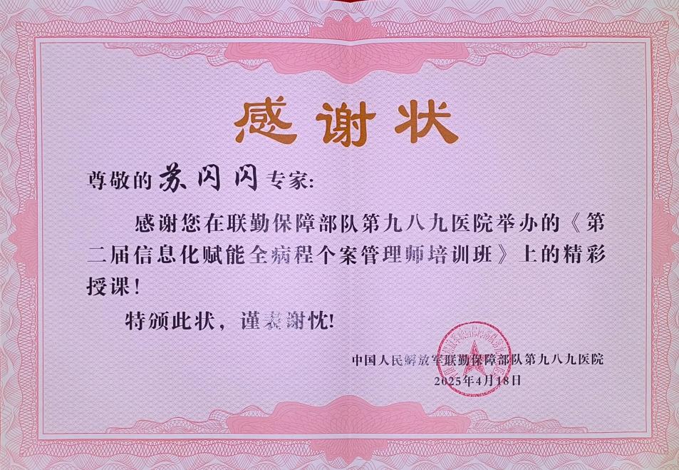 九八九医院对此次授课给予高度评价,并颁发感谢状。作为我院护理专业实践教学与就业对口帮扶医院,九八九医院长期为我院学生提供优质临床实践平台,近三年累计接收实习生100余人次,助力学生实现“理论-实践-职业发展”的无缝衔接。此次苏闪闪老师的授课进一步深化了双方在学术交流、人才培养等领域的合作,为未来联合申报科研项目、共建教学资源奠定了坚实基础。