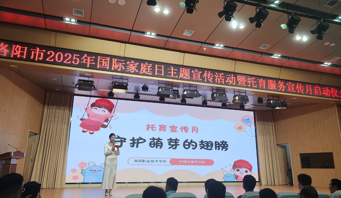 2025年5月15日,洛阳市2025年国际家庭日主题宣传活动暨托育服务宣传月启动仪式在洛阳市妇幼保健院隆重举行。洛阳职业技术学院护理与康养学院学生以原创情景剧《守护萌芽的翅膀》深情演绎托育服务中的温情与责任,成为活动亮点,获得现场观众与主办方的高度评价。