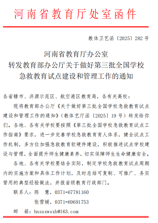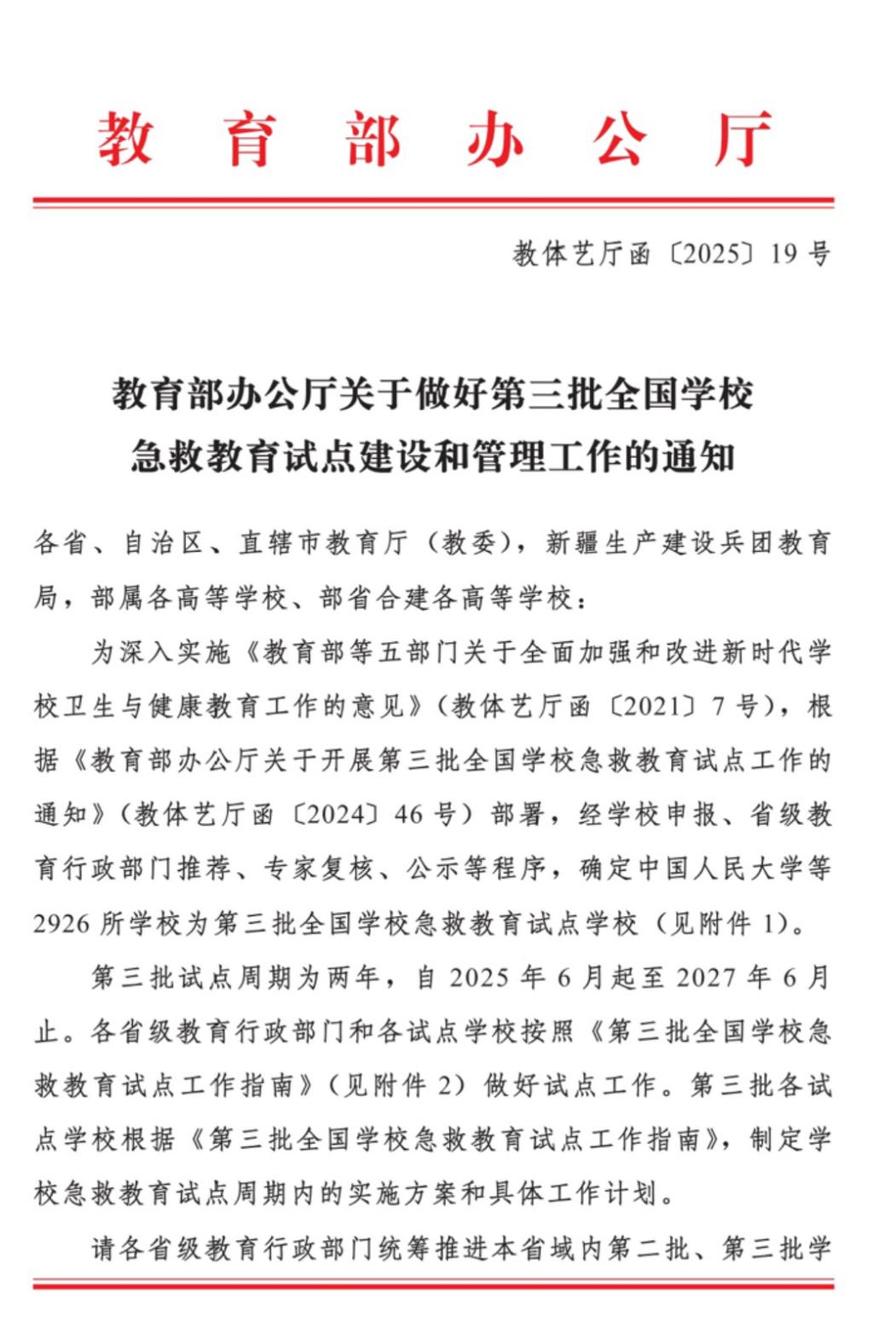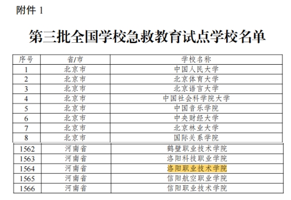 在教育部办公厅关于做好第三批全国学校急救教育试点建设和管理工作的通知(教体艺厅函〔2025〕19 号)中获悉,洛阳职业技术学院获批第三批全国学校急救教育试点学校。