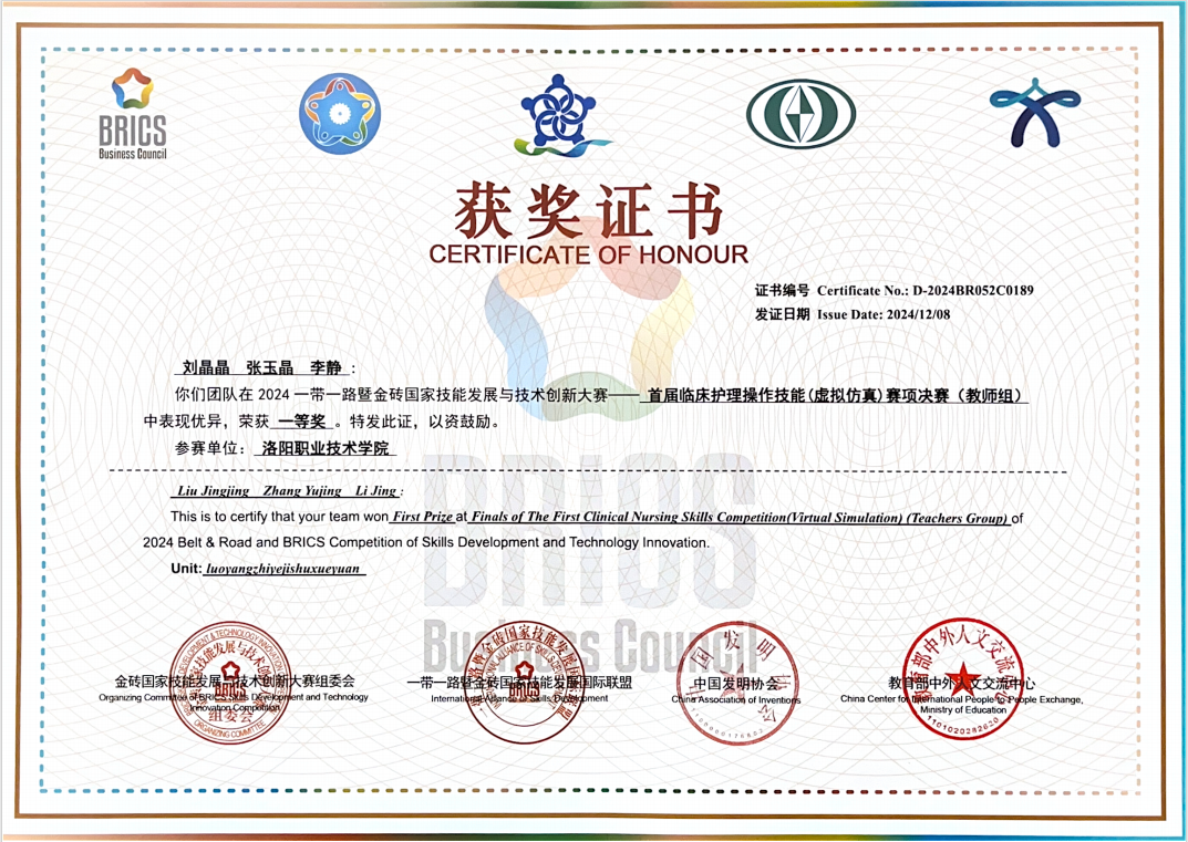 1 | 2024一带一路暨金砖国家技能发展与技术创新大赛之首届临床护理操作技能(虚拟仿真)赛项教师组 | 一等奖1项 |