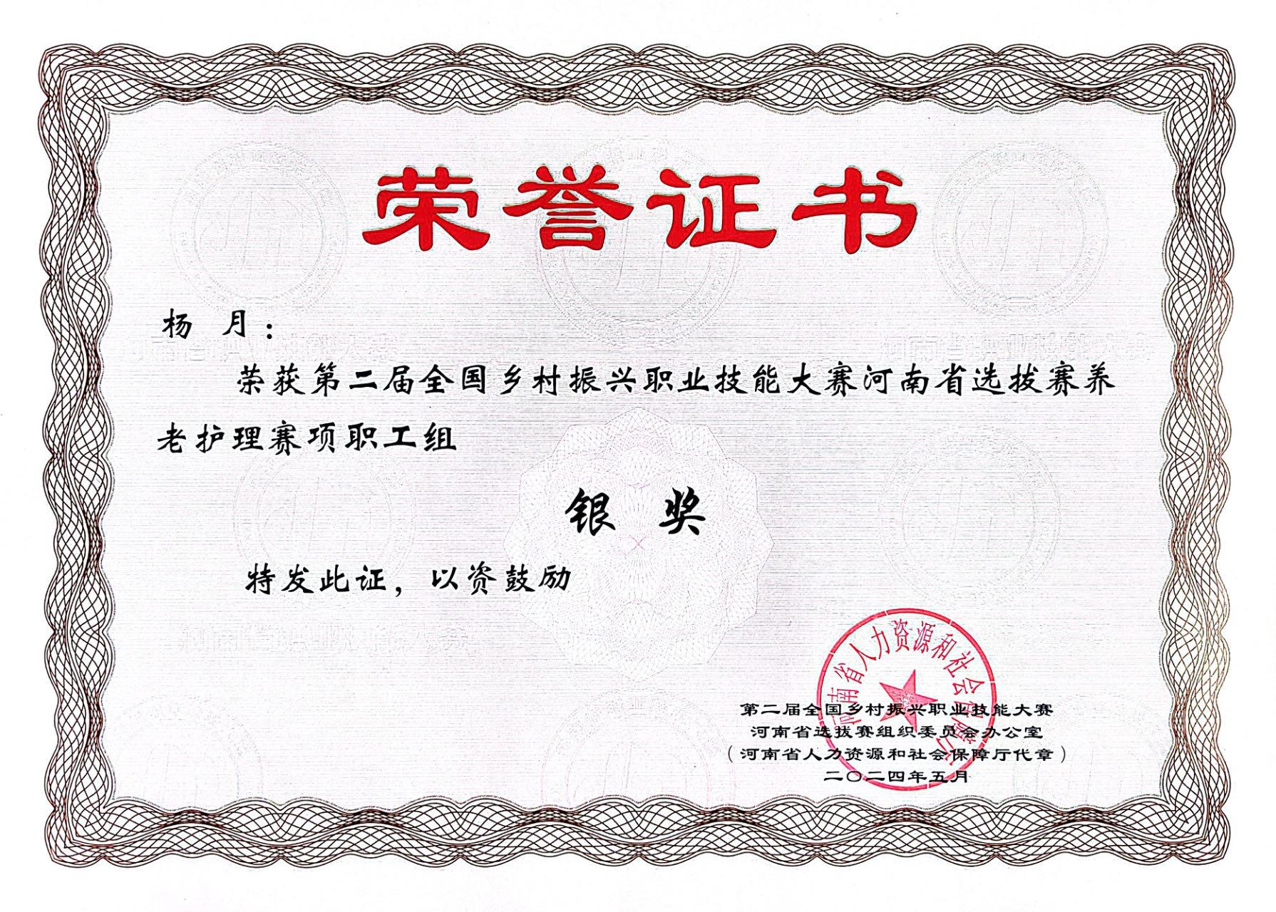 3 | 2024全国第二届乡村振兴职业技能竞赛河南省选拔赛养老护理项目职工组银奖 | 河南省人力资源和社会保障厅 | 2024.05 |