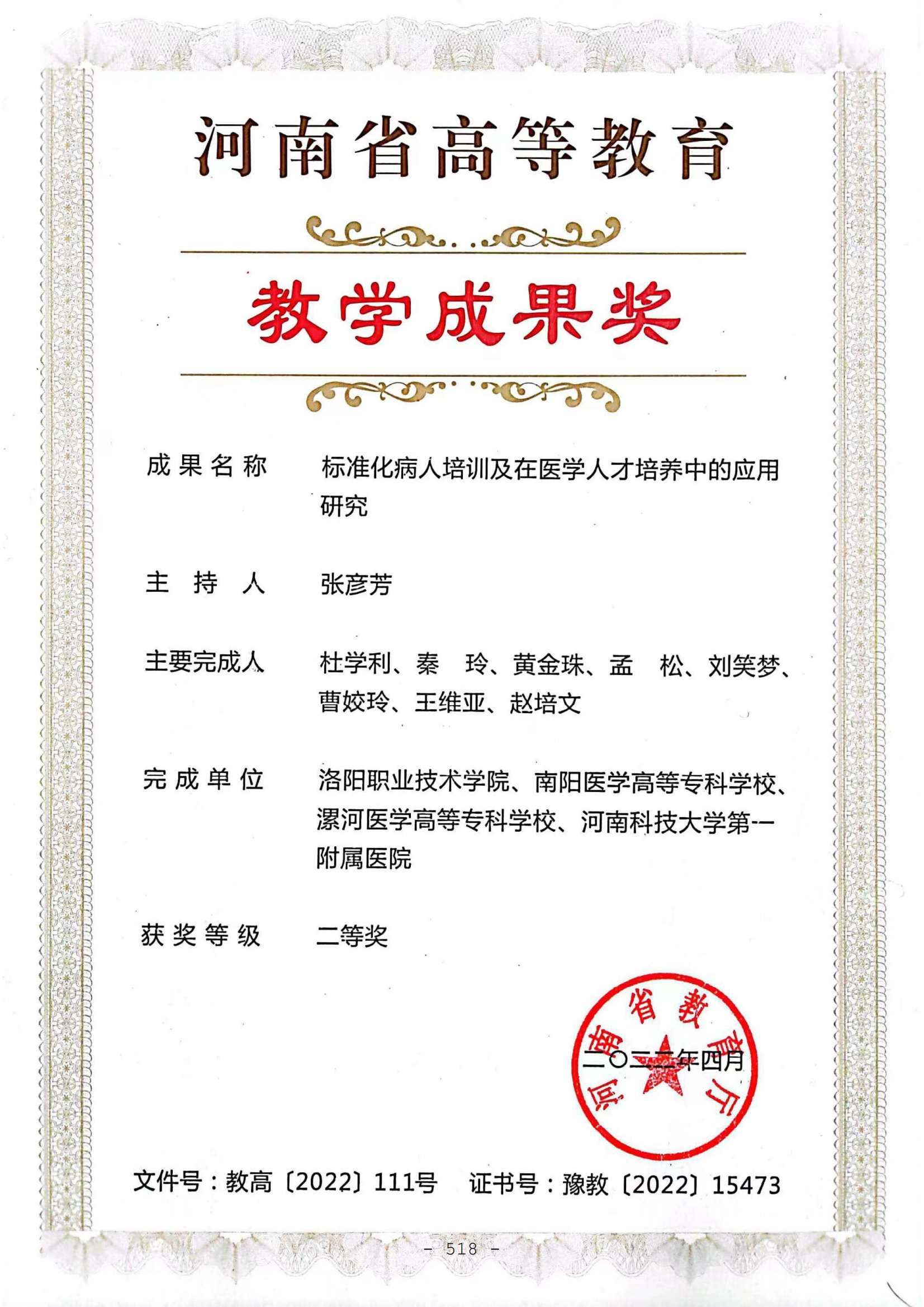 该成果依托河南省科技攻关(软科学)项目,团队编制了一套 SP 培训方案和案例脚本,出版一本专著,培训了一批SP 培训师及学生 SP,建成全国“标准化病人”教学基地,在多个医药卫生专业教学和技能核中采用SP 教学方法,提高了学生的沟通能力、收集病史资料能力、临床思维能力,减少了医患纠纷,提升了病人的满意率。