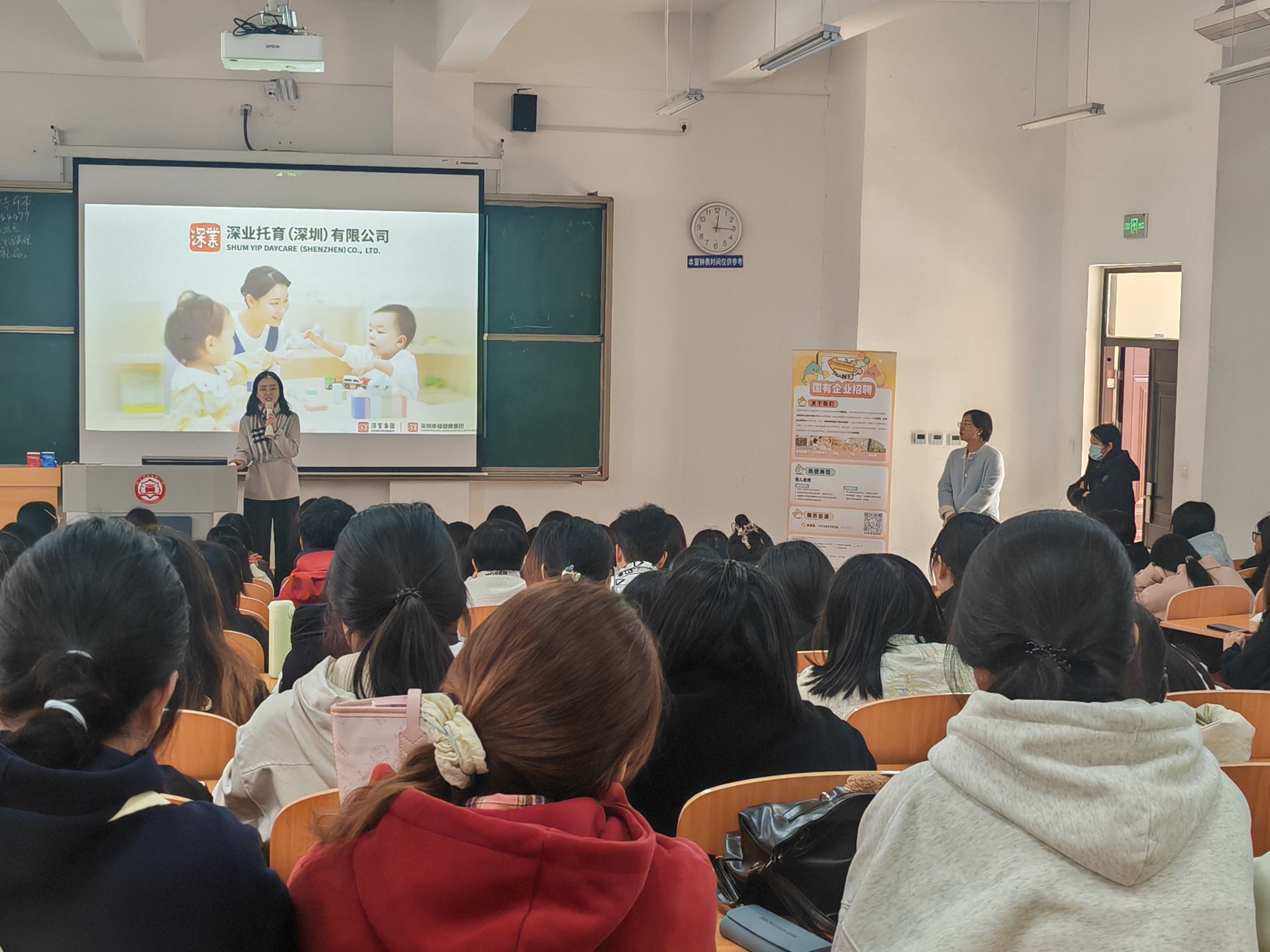 深业托育副总经理方圆详细解读了企业发展布局与人才需求标准。作为托育行业标杆企业,其打造的“幸福保教体系”“精细化照护体系”已形成全国示范效应,中心示范园等优质园区亟需高素质技能人才。希望双方能够达成深度合作,企业将为学生优先享受“实习-转正”直通车待遇,并享有带薪寒暑假等福利保障。随后深业托育方总为2024级、2025级近200余名学生进行企业宣讲,通过园区实景展示、优秀员工成长案例分享等形式,让学生直观了解后续职业发展路径。