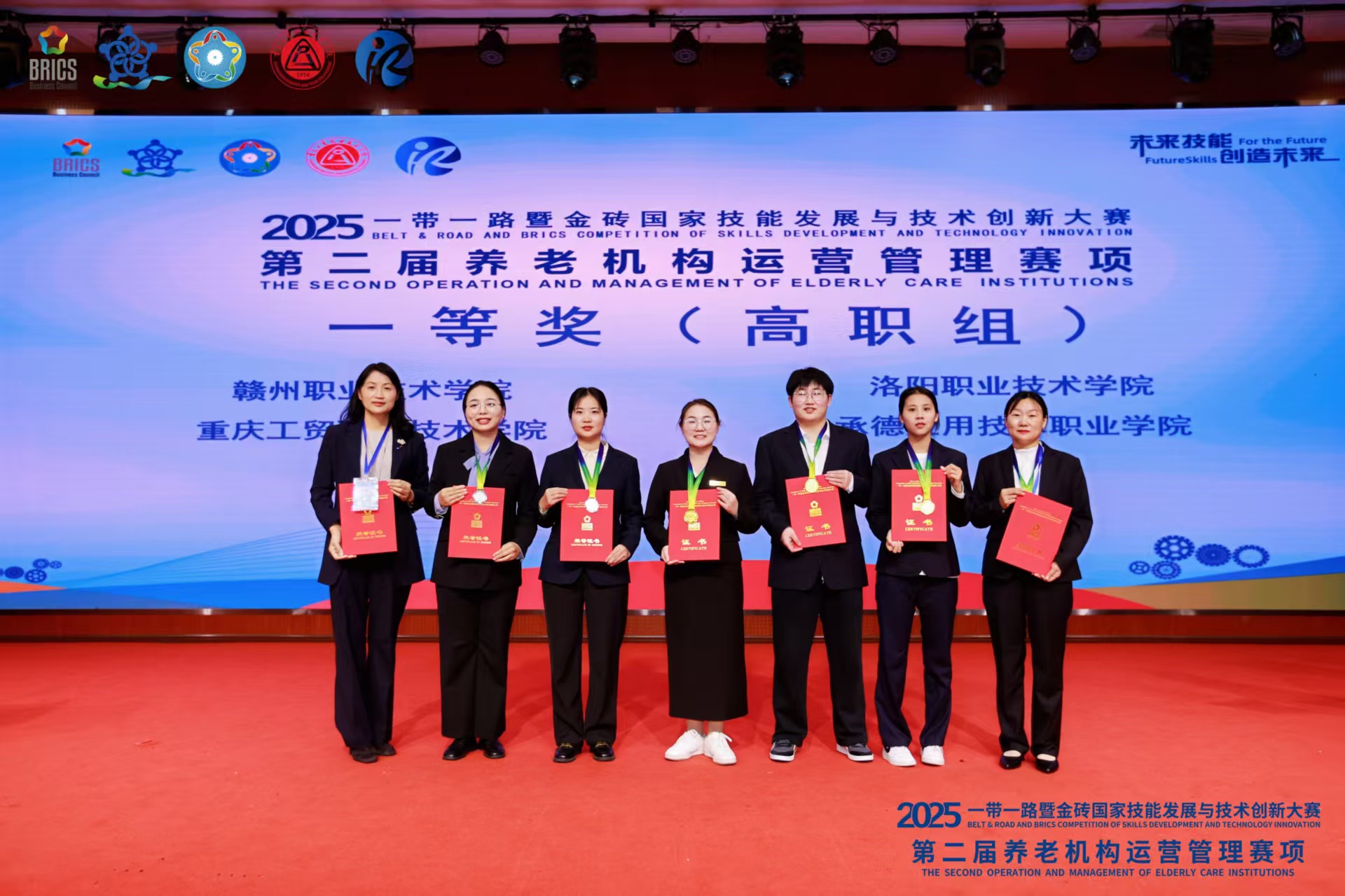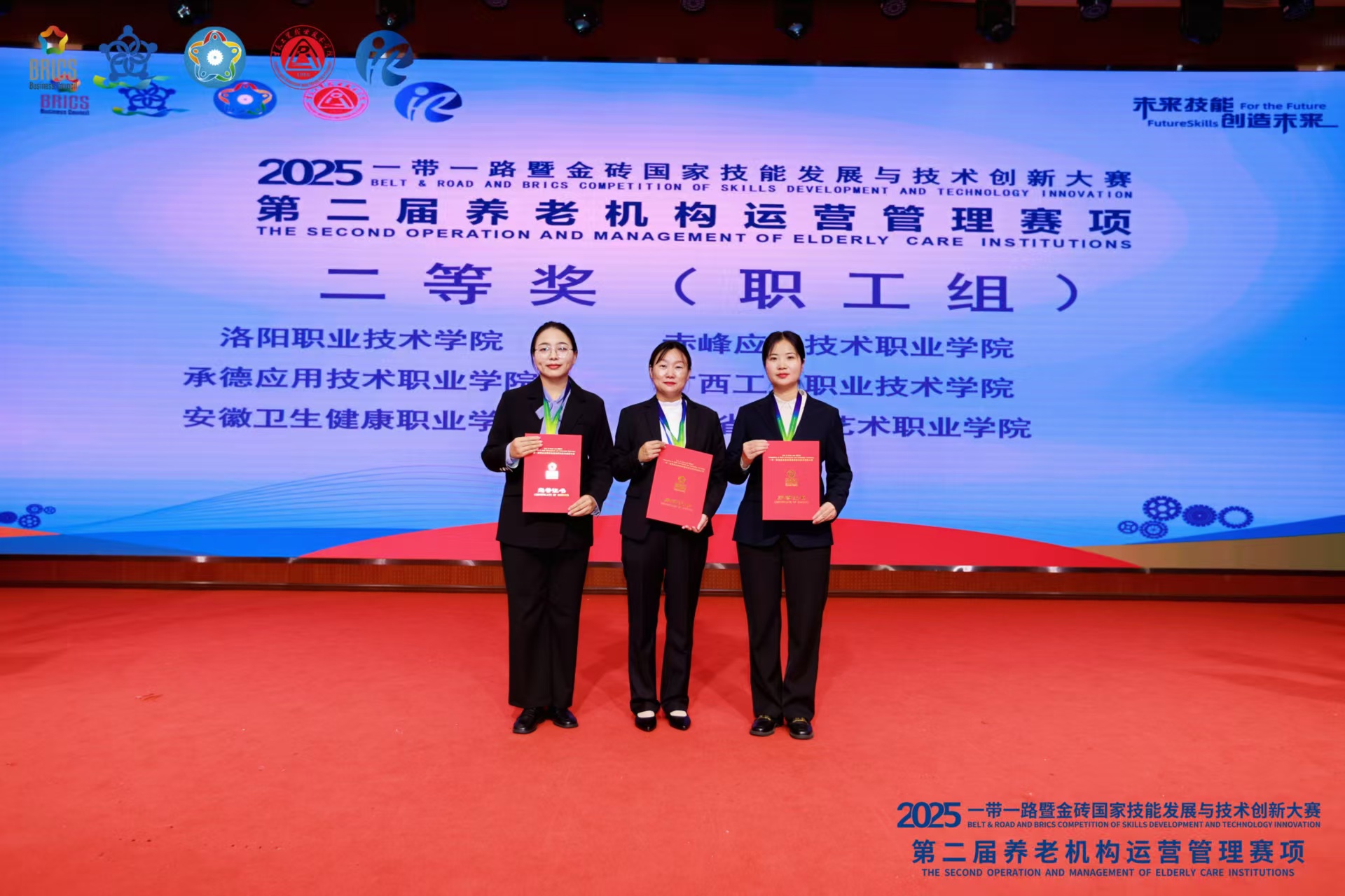 11月28-29日,2025年“一带一路”暨金砖国家技能发展与技术创新大赛养老机构运营管理赛项总决赛在重庆圆满落幕。该赛项吸引中、高职组和本科组、职工组86支队伍共258名选手同台竞技。我校智慧健康养老服务与管理专业23级304班周新杰、301班李怡琳、24级303班丁妍斩获学生组一等奖,智慧康养教研室关雨琪、杨月、杨琳教师团队获职工组二等奖第一名。