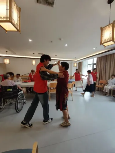 歌曲过后老人们每日的康复疗养时间也到了。作为护理与康养学院的特色实践,学生们充分发挥专业特长,为老人提供个性化的康复训练指导。一位奶奶还兴致勃勃地与张奥博同学跳起了交谊舞,爷爷奶奶们看到了笑得合不拢嘴,纷纷竖起大拇指。同时,行动不便的李爷爷在学生的辅助下完成了简单的肢体训练,连连称赞:“这些娃娃们手法专业,讲解也清楚,我这老胳膊老腿感觉轻松多了!”